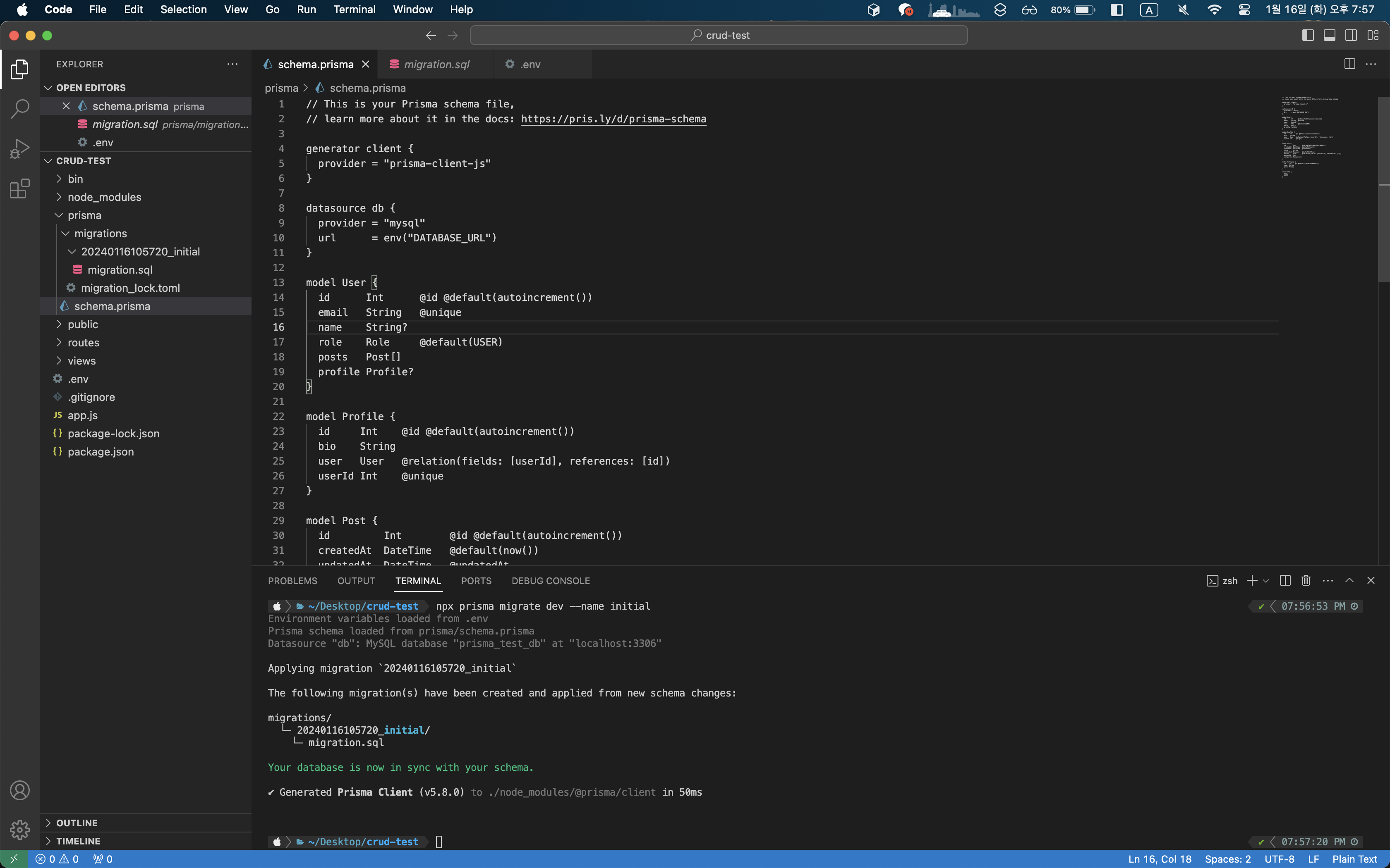 나는 vscode에서 $ npx prisma migrate dev --name initial 커맨드를 입력하였고 아래 사진처럼 20240116105720_initial 디렉터리에 migration.sql 파일이 생성된 것을 볼 수 있다. $ npx prisma migrate deploy [nameOfMigration] 커맨드를 실행하면 원하는 마이그래이션 파일로 덮어씌울 수 있고 $ npx prisma db pull 커맨드 실행을 통해