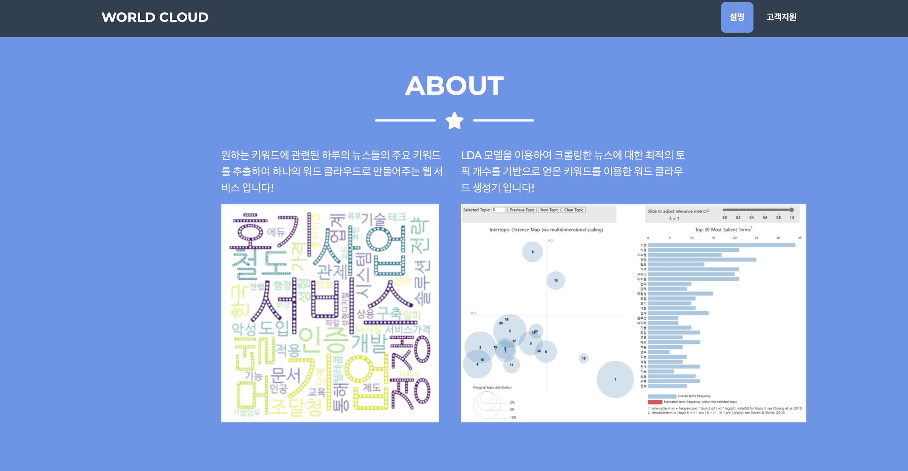 - LDA 모델을 이용하여 크롤링한 뉴스에 대한 최적의 토픽 개수를 기반으로 얻은 키워드를 이용한 워드 클라우드 생성기