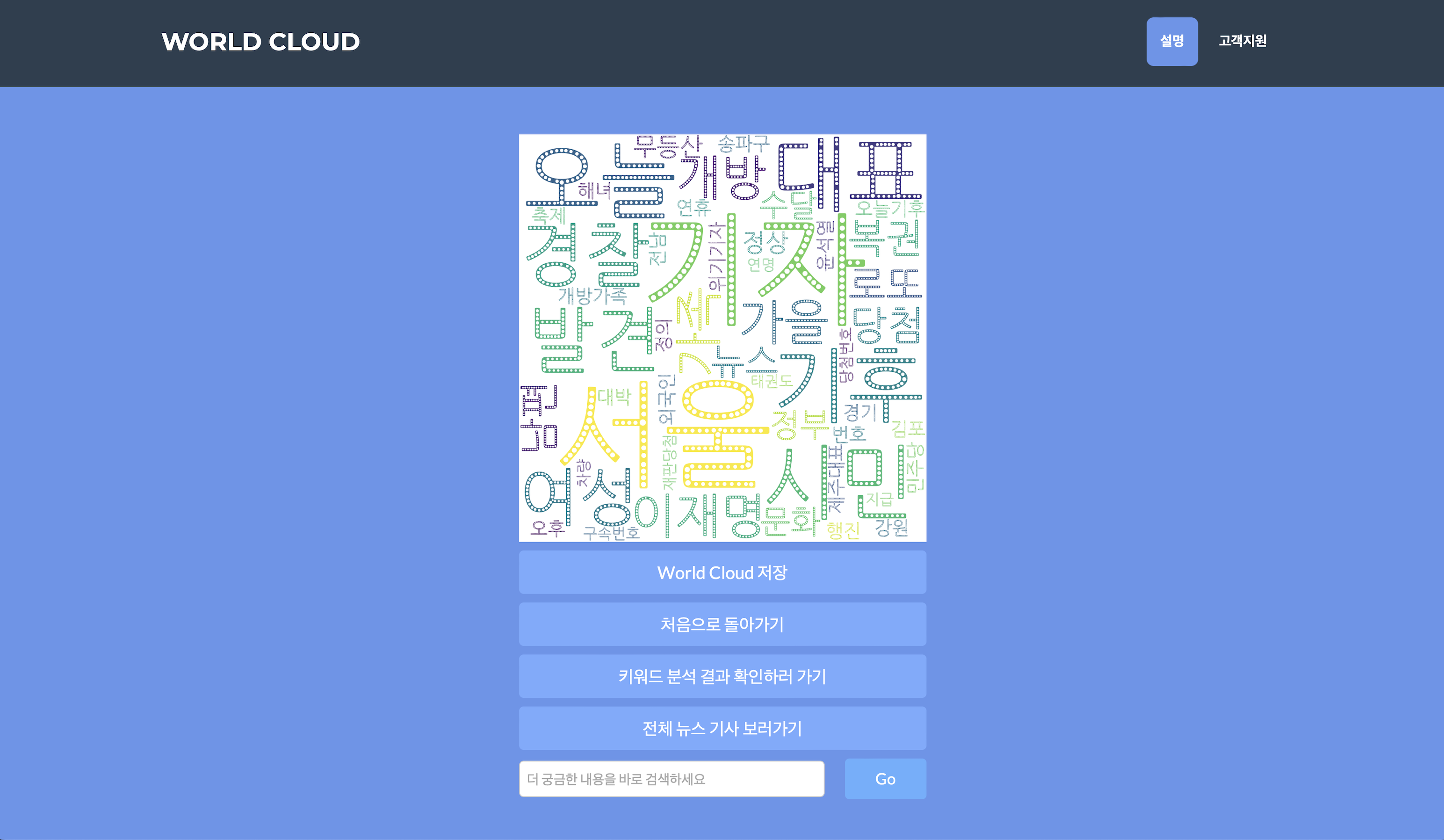 - 원하는 키워드에 관련된 하루의 뉴스들의 주요 키워드를 추출하여 하나의 워드 클라우드로 만들어주는 웹 서비스