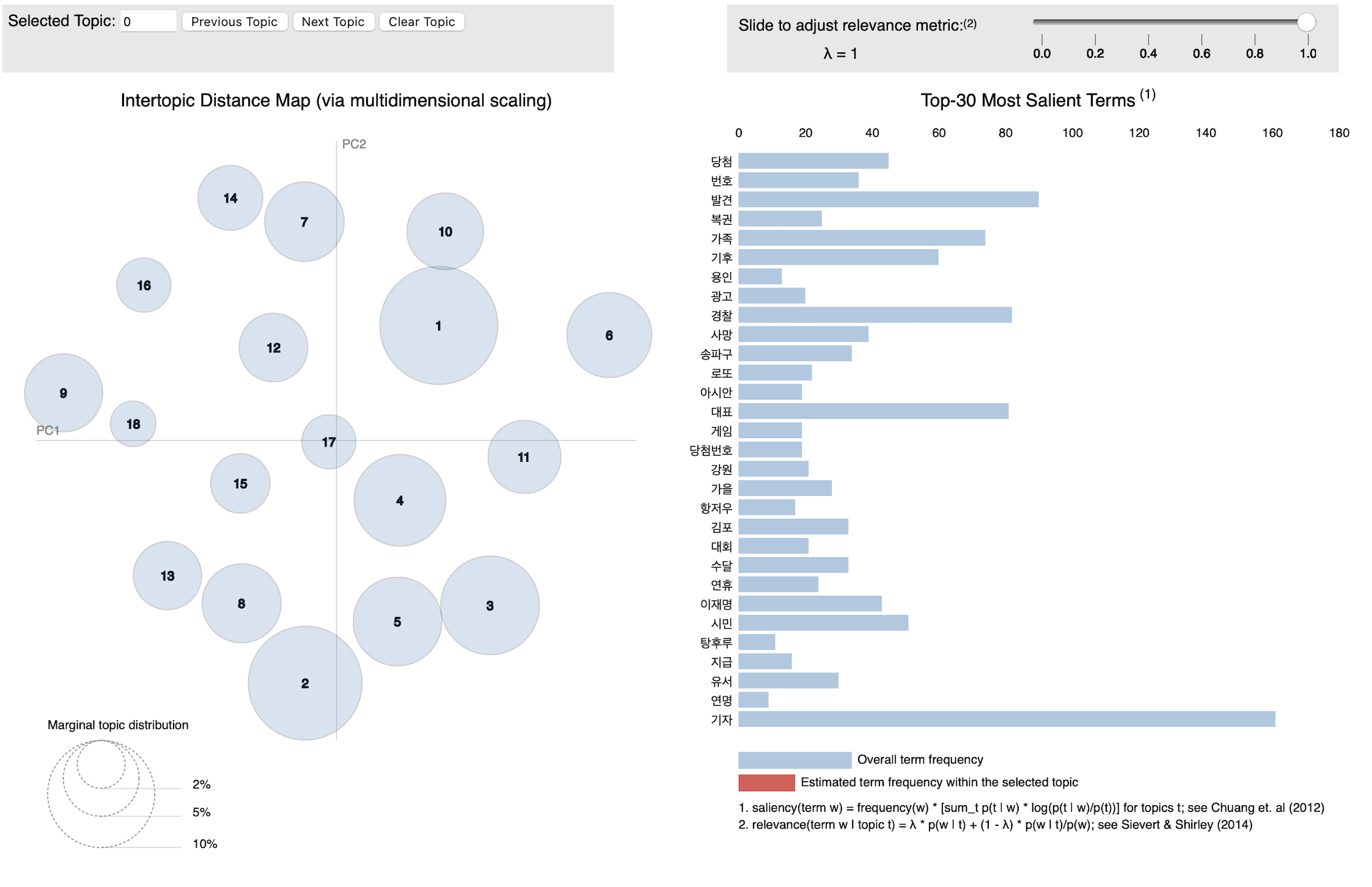 키워드 분석 결과 확인하러 가기 버튼을 누르면 아래와 같이 토픽 별 키워드의 빈도수를 확인할 수 있는 pyLDAvis 파일을 볼 수 있습니다.